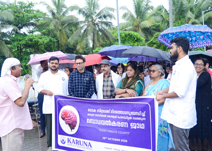 Karuna Medical College Hospital observed World Stroke Day 2025 with great enthusiasm at Pudunagaram PHC. The event featured a health talk and an awareness rally aimed at educating the public on stroke prevention, early recognition of symptoms, and the importance of timely medical care. Faculty members, students, and healthcare staff actively participated, spreading the message — “Minutes can save lives.”
